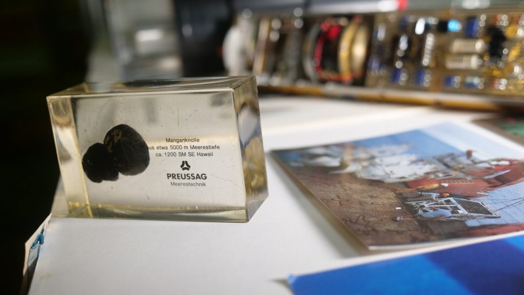 Ansonsten eher unsichtbar, nach Gebrauch vernichtet – aber für die Bauteilbörse Hannover gerettet und präsentiert: Industrieabfälle aus der Erforschung des Tiefsee-Meeresbodens bezeugen den hohen Aufwand seit vielen Jahren, um den Ressourcenhunger der Menschheit zu stillen.